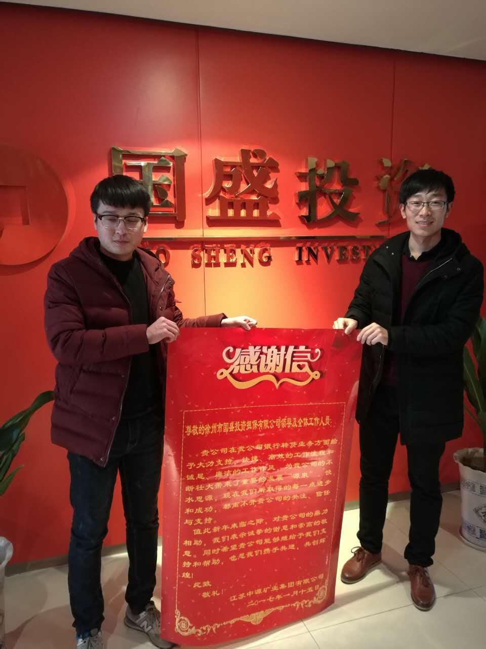 1月25日,国盛公司收到江苏中源矿业集团有限公司赠送的锦旗与感谢信,对国盛公司给予的应急周转资金支持表示真诚地感谢。