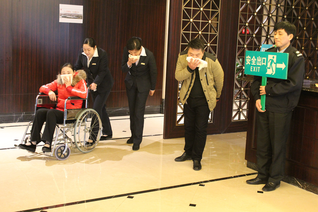 随着火灾警报的响起,消防安全疏散演练拉开帷幕。演练假设酒店三楼一客房发生火情,且火势迅速蔓延。在负责人的指挥下,灭火组立即前去扑救初起火灾,疏散组有序组织人员向预定安全区域转移,通讯组实时通报各组情况并保持信息畅通,防护组及时对人员进行救助和安抚,其他各小组均按照演练方案认真履行各自职责。演习过程中,大家用湿毛巾捂住口鼻,低头弯腰,迅速到达指定地点,随后火情成功扑灭。演习结束后,安保部经理结合酒店工作特点,有针对性地向员工讲解了日常防火灭火知识、正确拨打火警电话的方法、快速扑救初起火灾的技巧、组织人员疏散及火场逃生自救注意事项等消防安全知识。