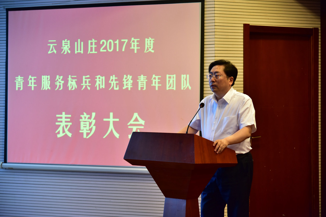 5月27日下午,云泉山庄召开2017年度青年服务标兵和先锋青年团队表彰大会,杨国华副总经理宣读表彰决定,李中亚总经理为获奖员工颁发证书。